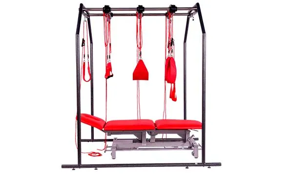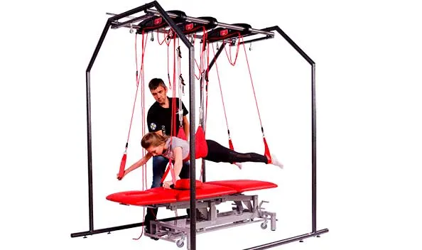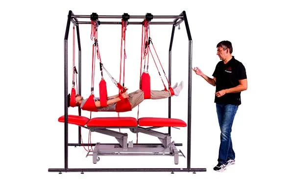 The patient is placed on a table driven by a Kinezo-Expert electric drive. Slings are fixed under the patient's limbs, pelvis and/or chest using carabiners on cables hanging down from the ceiling structure. A wide sling mounted on thick elastic straps can be placed under the patient's body to facilitate exercising. In the stretched position, this sling is used to lift the body or its parts upward. Then the table is lowered or the sling cables are pulled up lifting the patient's arms and legs. As a result, the patient's body or its parts are suspended. A rehabilitation session includes a number of exercises.