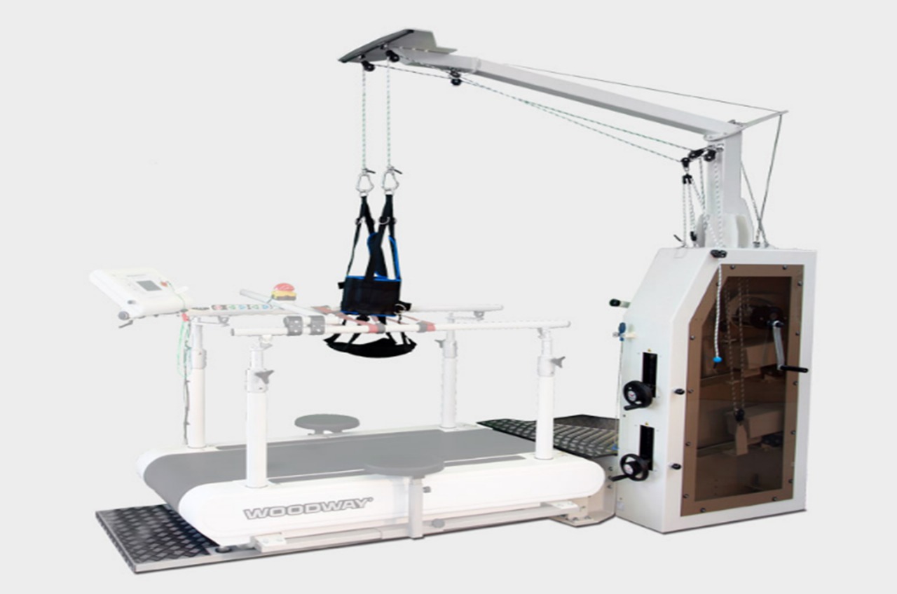 Therapist’s hands are free to perform neuromuscular re-education in the form of assisted placement of the feet and legs while “walking”.