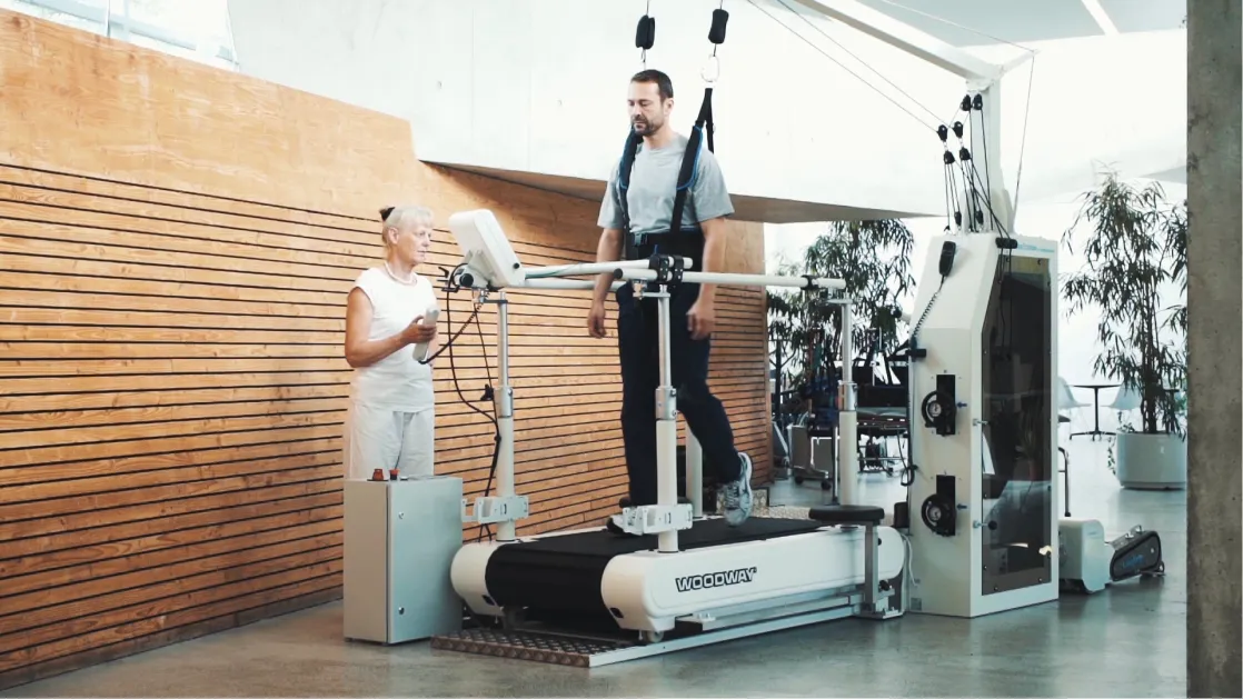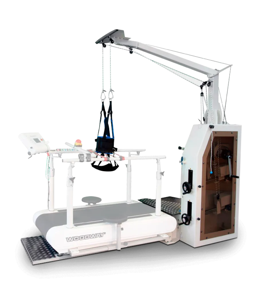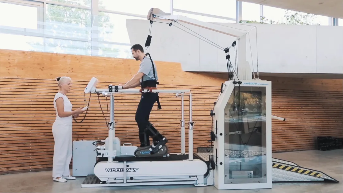 The LokoStation is specially designed for training and rehabilitating gait-impaired patients. With the Loko, therapists have the ability to quickly and conveniently redistribute the weight thanks to the off-loading system, enabling the patient to focus on coordination without the risk of falling. Paired with the Woodway PPS, the walking surface absorbs impact to prevent further deterioration of bones, tendons, ligaments and muscles of the lower extremity, pelvis and lower back.