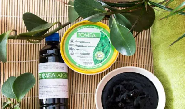 TOMED APPLICAT The therapeutic mud is applied on a areas of the body which need treatment. The product is available in plastic containers of 250 grams, 1 kg, 5 kg and 10 kg. A treated area must be covered with a PET film. The procedure duration is 20–40 minutes. The treatment consists of 10 – 20 procedures. TOMED AQUA Concentrated aqueous solution of humic compounds. Available in 1 L plastic containers. Application: Dilute 200 ml. of TOMED AQUA in 200 liters of water.